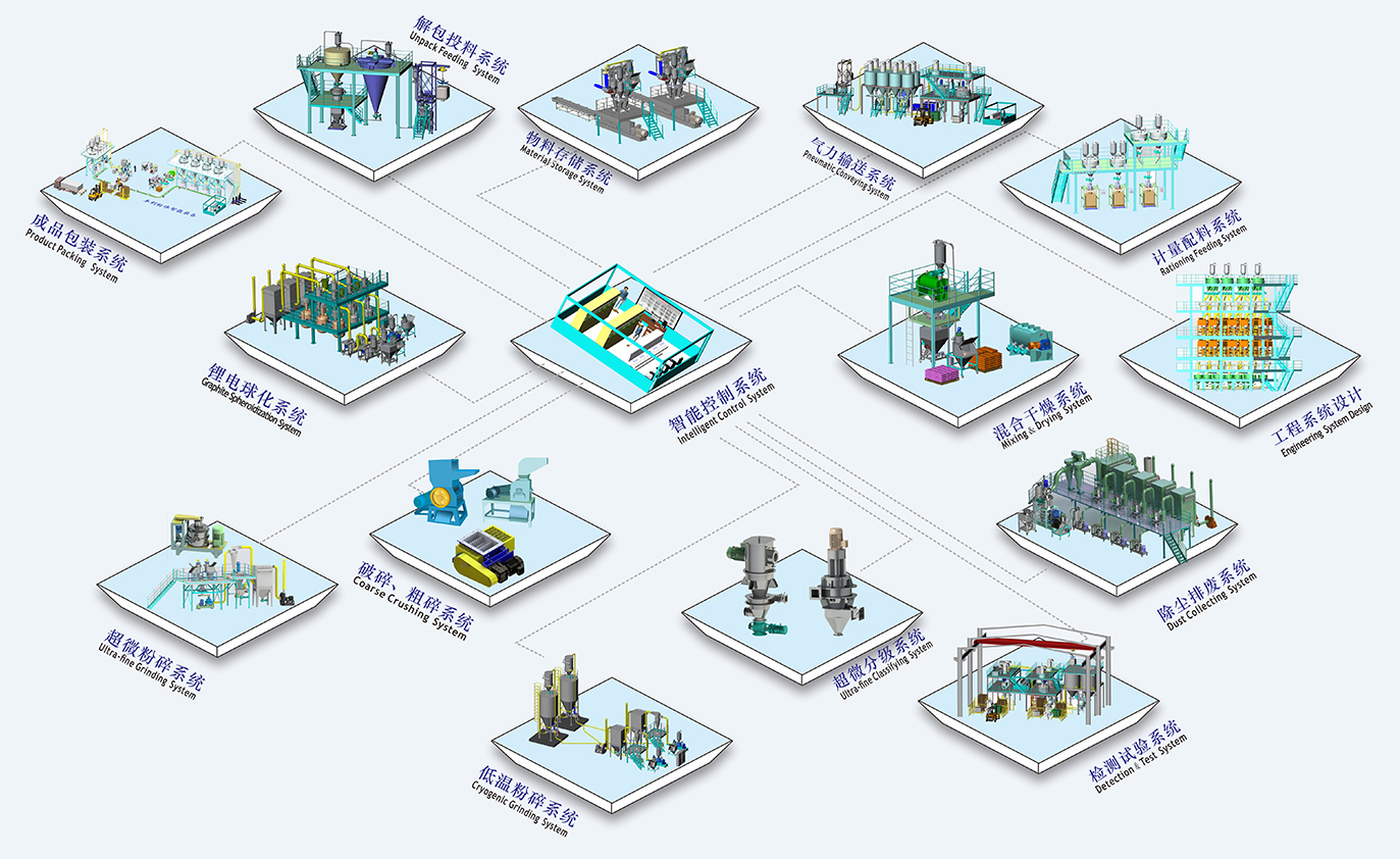 公司自1998年从事锂电石墨微粉球化粉碎深加工成套设备的开发应用,集成国内外先进粉体加工技术,引进吸收消化再创新,集成各类技术,进行创新。开发了新-代的鲤电池石墨新材料微粉球形化成套设备。该生产线有上料系统、粗粉碎系统、微粉球形化粉碎系统、尾料收集系统、成品输送系统和自动化系统等组成,形成年产1000~3000吨成套生产线。能将天然石墨、人造石墨和其他易石墨化的碳材料粉碎至粒度在5~ 30um范围,产品球化得率高,振实密度好,产量高。该成套设备已有数十条生产线,广泛应用于国内外锂电石墨新材料行业。